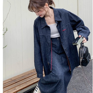 复古休闲藏蓝色牛仔衬衫套装女2025春秋超火巨好看包臀长裙两件套