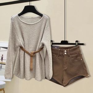 今年流行一整套女2025秋冬新款宽松减龄针织衫高腰牛仔短裤两件套