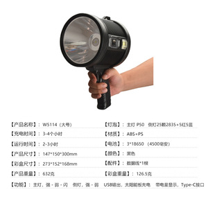 跨境探照灯太阳能USB充电手握式LED多光源电量显示远射强光手电筒