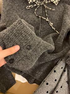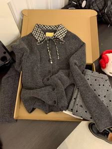 高级设计感格纹拼接polo领系带长袖女韩系立体纽扣针织衫外套上衣