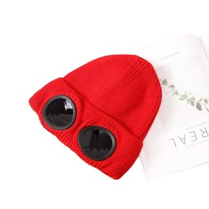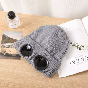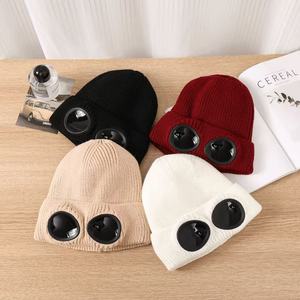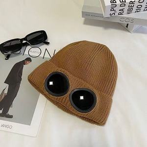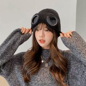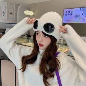 秋冬帽子女眼镜装饰毛线帽飞行员蛤蟆镜保暖滑雪加绒加厚针织帽男