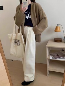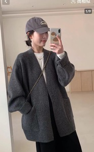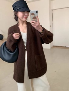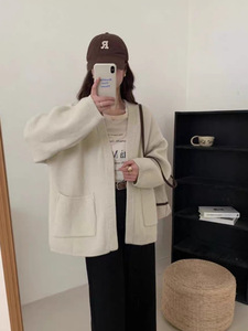 韩版慵懒风V领口袋针织毛衣女秋冬新款简约软糯宽松外搭针织开衫