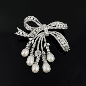 新款奢华微镶锆石蝴蝶结胸针高档女淡水珍珠流苏胸花秋冬大衣别针