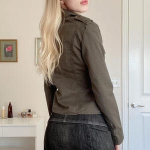 秋冬新品口袋拼接工装风衬衫上衣辣妹街头古着感翻领排扣开衫外套