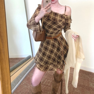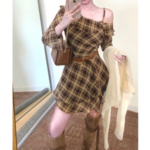 法式复古荷叶边格子连衣裙女设计感不规则收腰气质露肩短裙子秋季