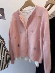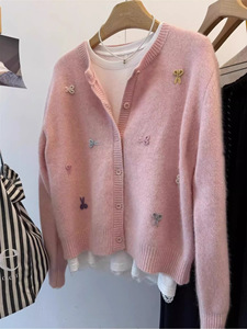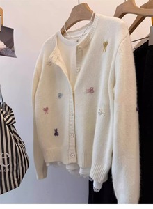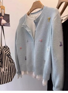 温柔风软糯蓝色针织开衫毛衣外套女秋冬外穿小个子宽松浣熊绒上衣