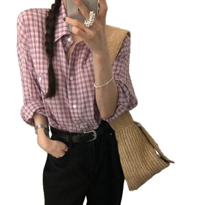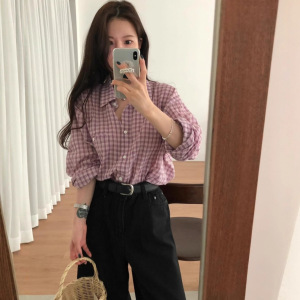 韩国ins韩系慵懒风气质翻领单口袋设计宽松显瘦格纹长袖衬衫女