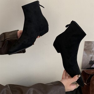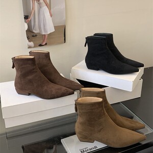 韩版2025秋冬新款简约绒面瘦瘦骑士靴法式尖头低跟短靴女