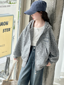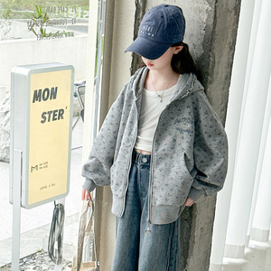女童外套秋装2025新款儿童洋气碎花大童女孩宽松连帽开衫卫衣批发