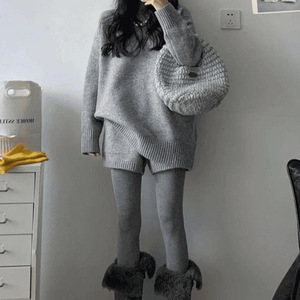 2025时尚套装灰色宽松休闲毛衣针织衫女秋冬感高腰休闲短裤两件套