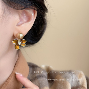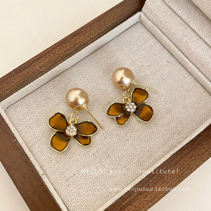 法式咖色美拉德秋冬珐琅复古珍珠花朵耳环轻奢设计高级耳坠耳饰