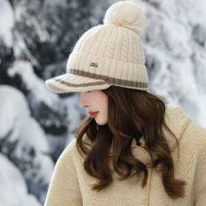 冬季帽子女新款加绒大毛球针织帽抗风御寒毛线帽休闲双拼色鸭舌帽