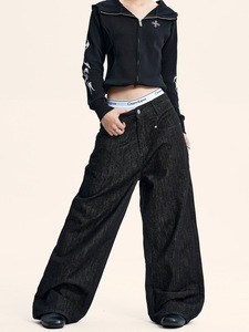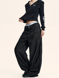 永坊美式复古原黑牛仔裤男女百搭竹节纹cleanfit简约休闲直筒长裤