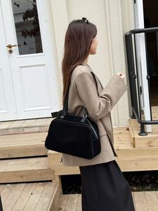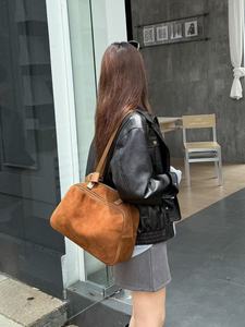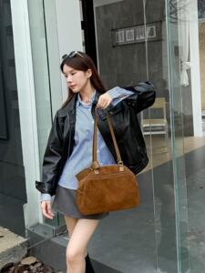 秋冬磨砂牛皮保龄球包复古真皮大容量枕头包高级感小众单肩腋下包