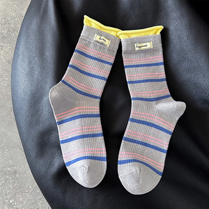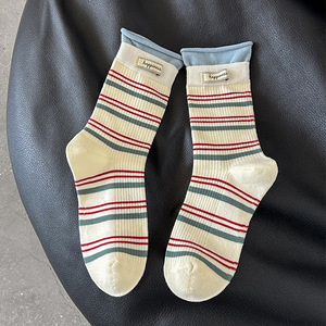 诸暨袜子女士新品韩系中筒袜条纹堆堆袜四季款双罗口拼色长筒袜