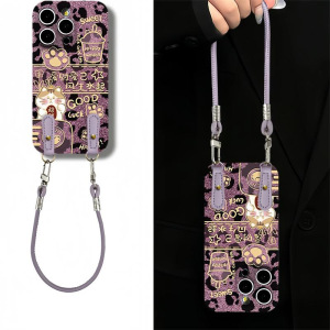 紫底豹纹爱财猫+皮扣挂绳+精孔菲林软壳