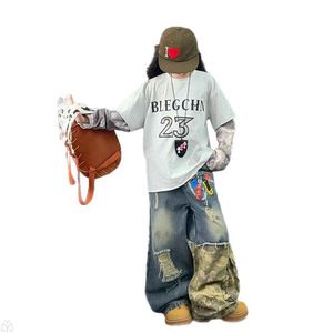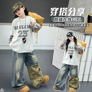 女童美式复古假两件长袖嘻哈设计感迷彩拼接破洞牛仔裤嘻哈套装潮