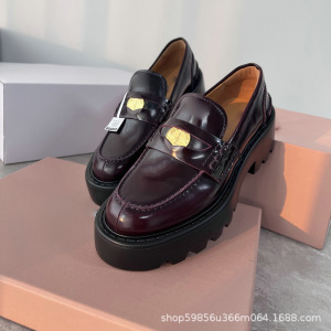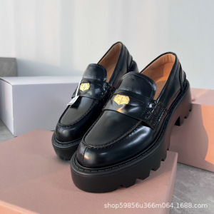 莞产高品质秋季新款金币乐福鞋真皮圆头一脚蹬粗跟厚底舒适单鞋女