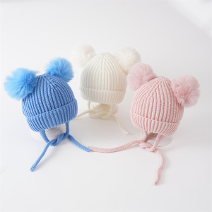 冬季保暖小孩双毛球套头帽婴幼儿条纹针织帽儿童加厚毛线帽子
