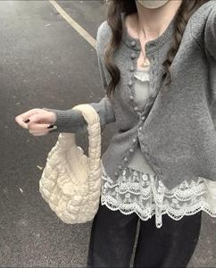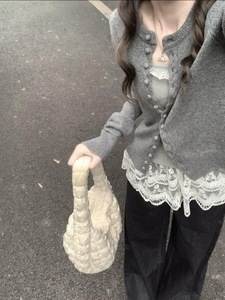 韩系复古灰色针织开衫女秋新款设计感上衣洋气别致毛衣外套