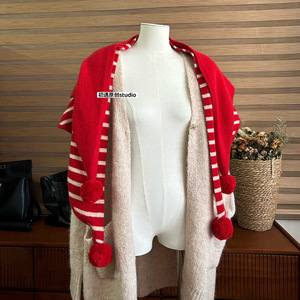 新款日系手工球球100羊毛条纹三角围巾圣诞主题红色围脖保暖百搭