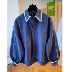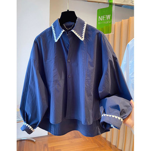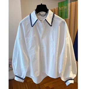 韩里韩气黄色长袖衬衫女早秋2025新款宽松撞色别致花边拼接衬衣