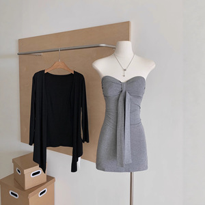 2025辣妹套装气质长袖开衫女秋季系带收腰抹胸包臀连衣裙两件套