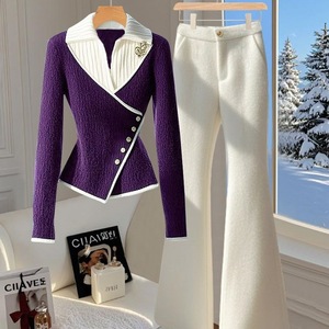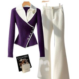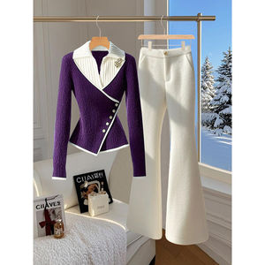 秋冬多巴胺时尚套装女2025新款紫色假两件毛衣白色微喇裤紫两件套