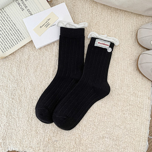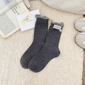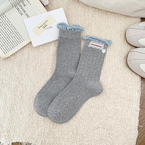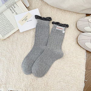 灰色袜子女新款纽扣字母布标中筒袜假两件拼色花边堆堆袜韩国袜子