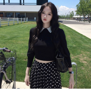 neurcz 黑色长袖针织衫女早秋修身显瘦简约百搭休闲翻领上衣