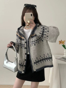 费尔岛重工提花连帽开衫毛衣女2025秋冬新款韩系慵懒风针织外套厚