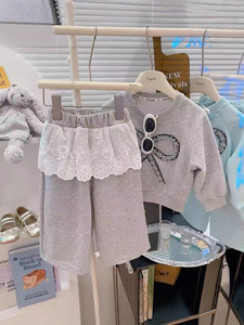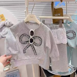 女童2025春秋季新款蝴蝶结蕾丝花边套装中大童卫衣卫裤休闲两件