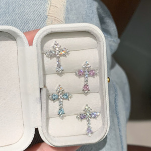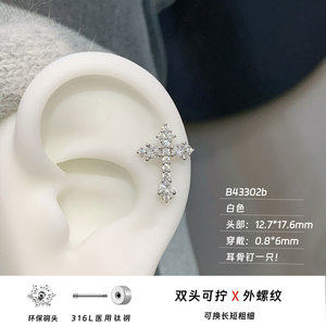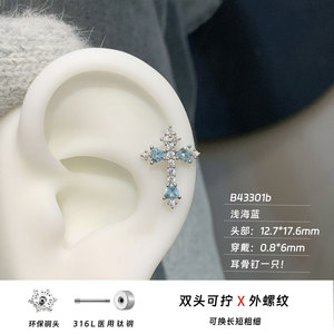 爆闪浅海蓝十字架锆石耳骨钉个性甜酷风316L钛钢耳饰