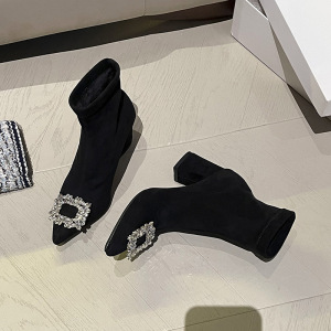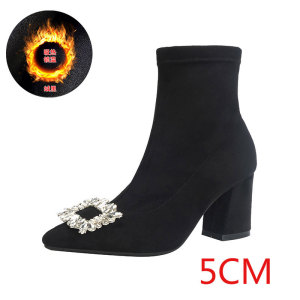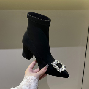 尖头粗跟秋冬粗跟网红水钻方扣高跟瘦瘦靴加绒弹力袜靴绒面短靴女