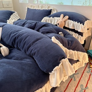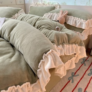 A类法式小清新纯色牛奶绒花边款四件套公主风加绒被套珊瑚绒床品~