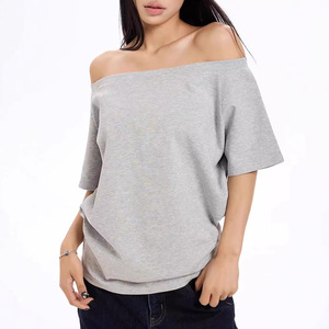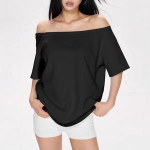 现货美式露肩小众设计短袖t恤辣妹一字领女宽松休闲显瘦斜肩上衣