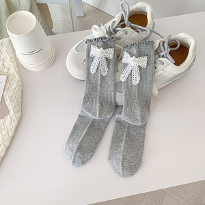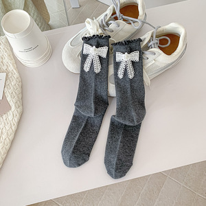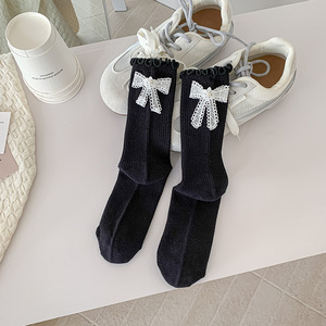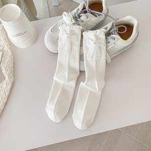后跟珍珠蝴蝶结袜子女芭蕾风中筒袜双针甜美木耳边堆堆袜配小皮鞋