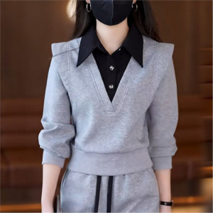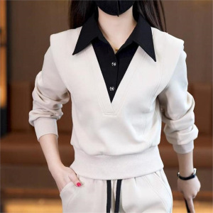 2025新款时尚休闲套装女早秋设计感假两件Polo衫上衣阔腿裤两件套