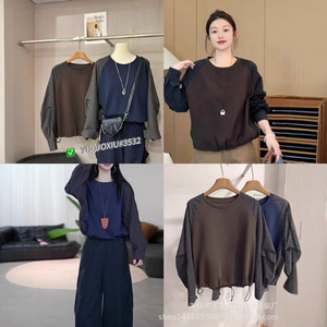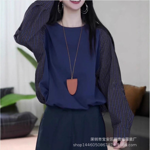 琪镌绘制轻奢复古格纹拼接假两件圆领长袖卫衣衬衫女秋季宽松上衣