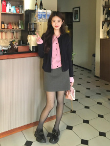 藏青色假两件针织开衫女早秋季2025新款毛衣外套短款上衣均码冰丝