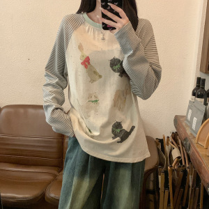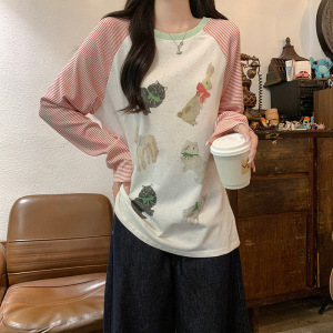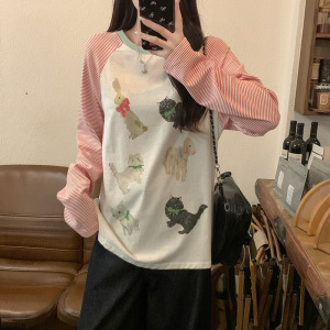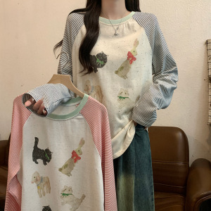 条纹插肩长袖圆领t恤女2025印花春季新款慵懒休闲宽松中长款上衣