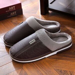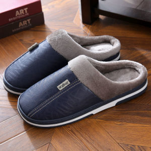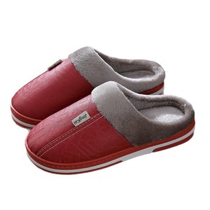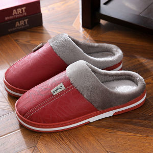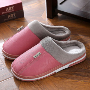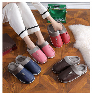 2025新款情侣棉拖鞋女冬季韩版情侣厚底加绒防滑皮面防水棉拖鞋男