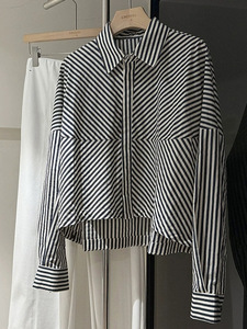 穿梭视觉 前短后长薄款蓝色条纹短款廓形宽松长袖单排扣夹克衬衫