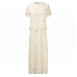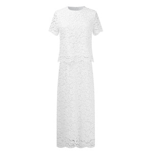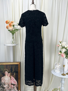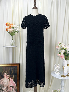 高档丝绒提花贵妇名媛风加绒短袖蕾丝裙子上衣+半裙两件套装多色