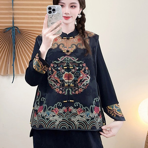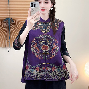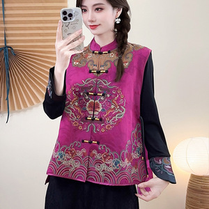 2025秋季新款复古立领盘扣无袖纯色民族风刺绣缎面前短后长马甲女