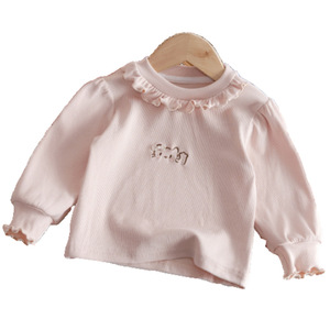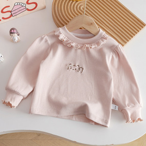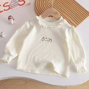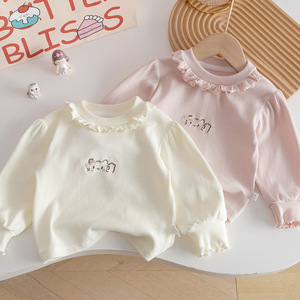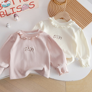 女童秋季T恤2025新款韩系木耳边领可爱猫咪洋气刺绣长袖打底衣衫
