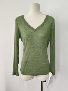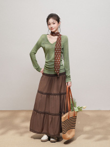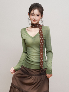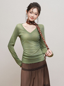季优 高级感绿色V领正肩长袖t恤女2025早秋修身显瘦穿搭薄款上衣