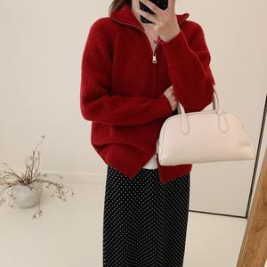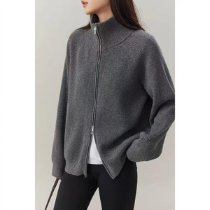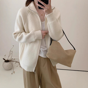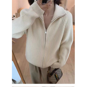 韩系chic简约立领针织开衫女秋冬加厚气质复古高级双拉链毛衣外套