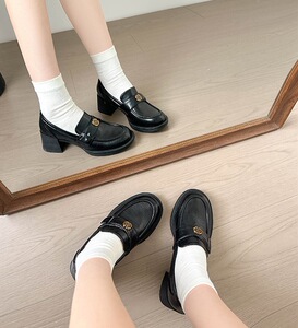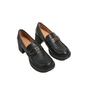 现货秒发~英伦复古山茶花高跟乐福鞋赫本风小个子粗跟厚底小皮鞋