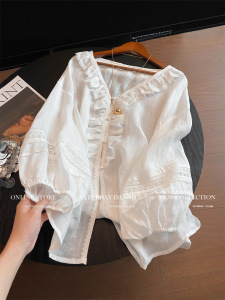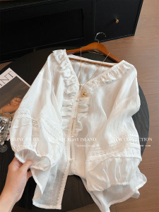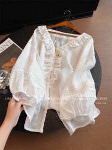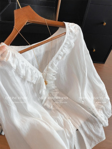 白色褶皱木耳边拼接蕾丝V领衬衫女2025夏季高级感通勤长袖上衣